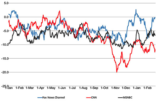 This graph, provided by internet research firm Yougov.com, clearly shows CNN’s viewership had significantly tumbled below MSNBC from November 2016 through February 2017. CNN is the red line. MSNBC is in black and Fox News is in blue.