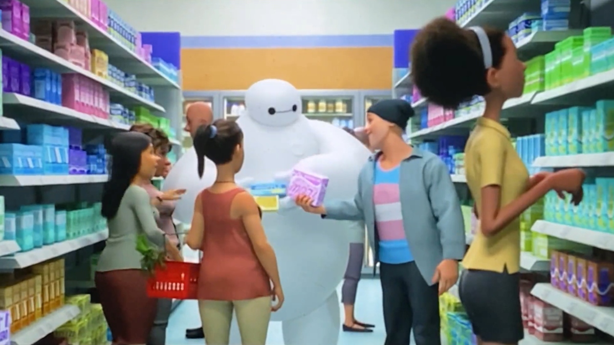 “These might be easier if it’s her first period,” yet another woman said as she held a package out to Baymax, while another woman approached the group, saying enthusiastically, “These are really environmentally friendly!”