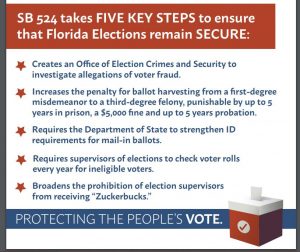 Governor Ron DeSantis is on the record saying, “Twenty years ago, nobody thought Florida was a prime example of how to conduct elections, but we have become a national leader by running the most secure elections in the country,” … “We need to do more to ensure our elections remain secure. We have ended ballot harvesting, stopped drop boxes and the mass mailing of ballots, and banned Zuckerbucks, and this bill will give us more resources to make sure bad actors are held accountable.”